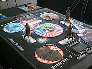 The final game presented at our Game Fair was Galaxy Station, made by another three-student team. In this game, players traveled around a game board collecting materials necessary to enhance their spacecraft, which each enhancement bestowing certain benefits. The final version of the game featured gorgeous-looking components, but what really captivated me was a game mechanics that rotated the central path on the board with each phase of the game, opening up different paths and opportunities for players to collect rate resources from the circular side paths. The game was eye-catching from a visual stand-point and its gameplay was compelling as well.