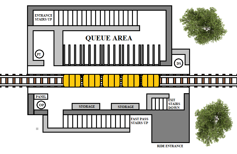 Once the train pulled into the station, both Point and Dispatch stomped down on large foot petals at left front corner of each car, and this would release the lap bars so that the guests could exit. We would then direct them to go down the stairs at the front of the station.