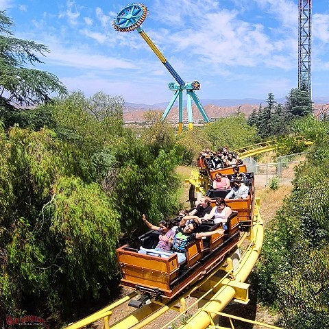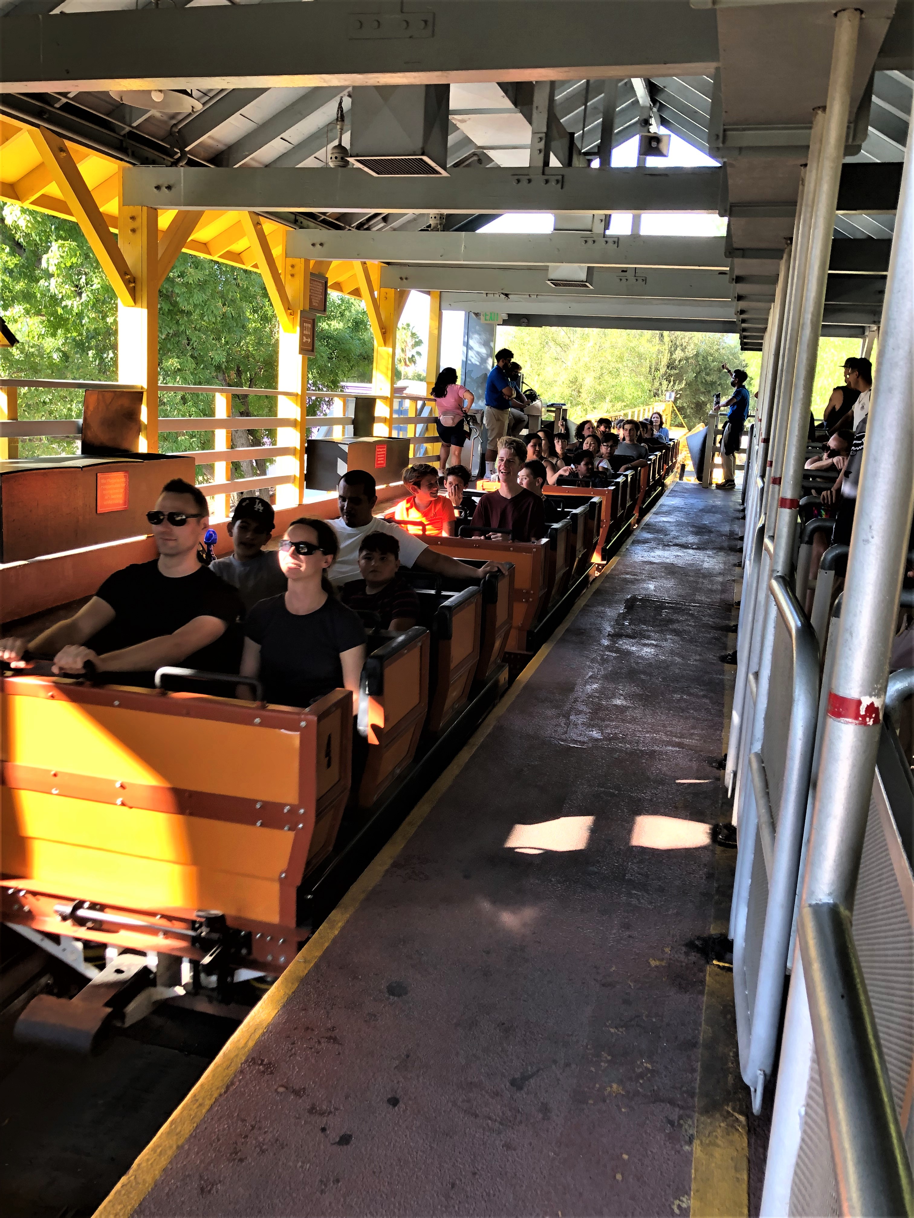 One thing I learned is that Magic Mountain is divided managerially into six areas, and new employees got to pick (or at least request) which area to work in. I requested Area 4 because it had the greatest variety of attractions — the new pendulum thrill ride Crazanity, the (air conditioned!) dark ride Justice League: Battle for Metropolis, the stand-up looping coaster Riddler’s Revenge, the spinning ride Scrambler, and a couple of the theme park’s opening day rides — the Jammin’ Bumpers bumper car ride and Gold Rusher terrain coaster, and I will describe my brief time working on those two attractions today.