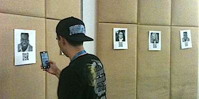 I next tell my students to download a free QR code reader to their smart phones. (Before class, I put up sheets of paper, each with an image of one of the subjects — again, no names — an a QR Code, around the room.) The students then must go to the paper with their subject’s image and then user their smartphone to read the QR Code, which will cause their phone’s web browser to go to a web page I wrote containing a brief biographical sketch about the subject.