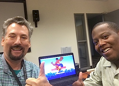 One of my former Game Production students, Jerry McClellen, stopped by my classroom at The Los Angeles Film School to show me the latest version of an platform he is developing, Rocket Brown. Wait, did I write “a platform game”? Rocket Brown is actually the star of a video game series. Jerry has been developing it as homage to retro gaming and anime through the lens of urban culture. Rocket Brown follows the adventure of an 80’s nerd that becomes a street fighter who defends his community from various existential threats.